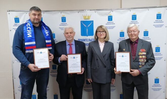 Министр внутренней политики и общественных отношений Саратовской области Наталья Трошина вручила благодарственные письма заместителю председателя президиума Владимиру Кудинову, члену президиума Семену Аношкину и заместителю председателя президиума по спорту Владиславу Онищенко.